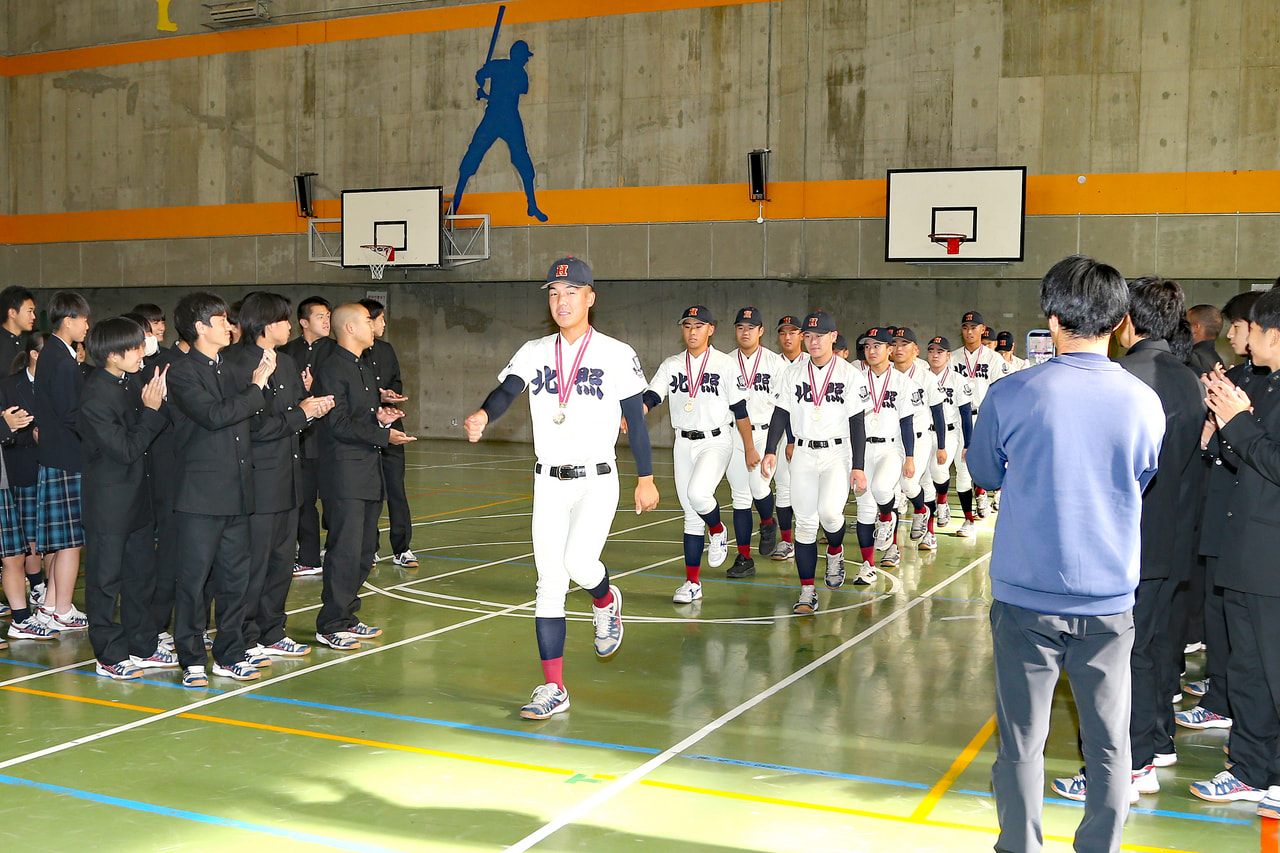 第78回秋季北海道高等学校野球大会で13年ぶり6度目の優勝を飾った野球部の大会報告会が10月21日、北照高体育館で行われました。全校生徒が拍手で出迎える中をナインは堂々と行進。手代…