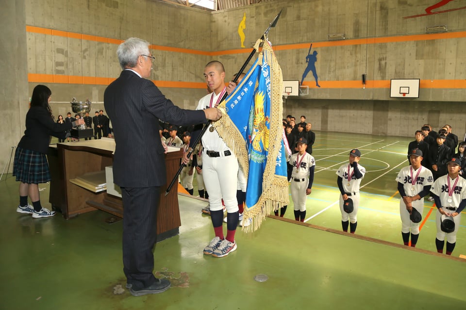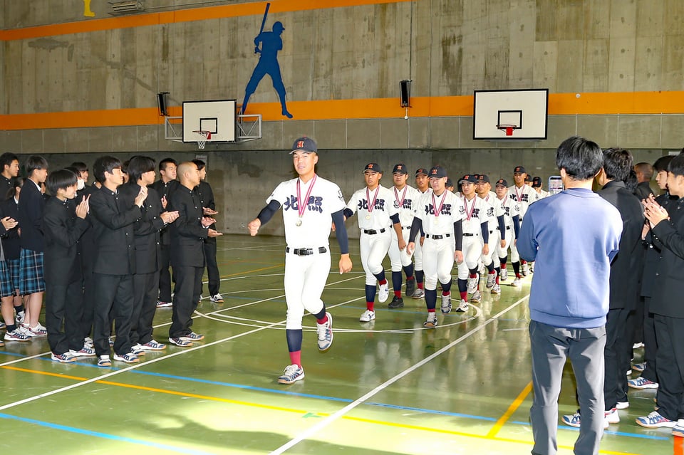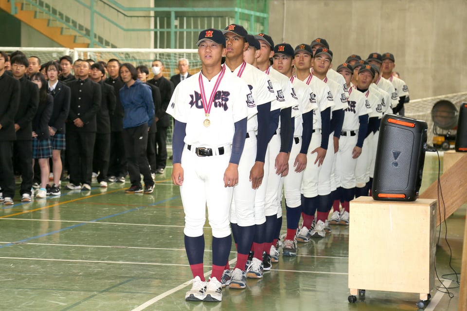 第78回秋季北海道高等学校野球大会で13年ぶり6度目の優勝を飾った野球部の大会報告会が10月21日、北照高体育館で行われました。全校生徒が拍手で出迎える中をナインは堂々と行進。手代森輝斗主将(2年)は「この秋季大会には、多くの先輩方の悔しい思いを胸に、リベンジを果たそうと強く思って臨みました。力のない私たちが優勝できたのは、札幌ドーム(大和ハウスプレミストドーム)に駆けつけてくれた先生方や、全校生徒の皆さん、悔しい思いをしたOBの方々や保護者の皆さまの応援のおかげだと思っています。本当にありがとうございました」と、感謝の気持ちを込めて挨拶しました。大会4試合34イニングを投げ抜いたエース右腕・島田爽介投手(2年)ですが「(肩の状態は)もうなんともないです。今日も1試合ぐらい投げられる状態」と笑顔で話してくれました。