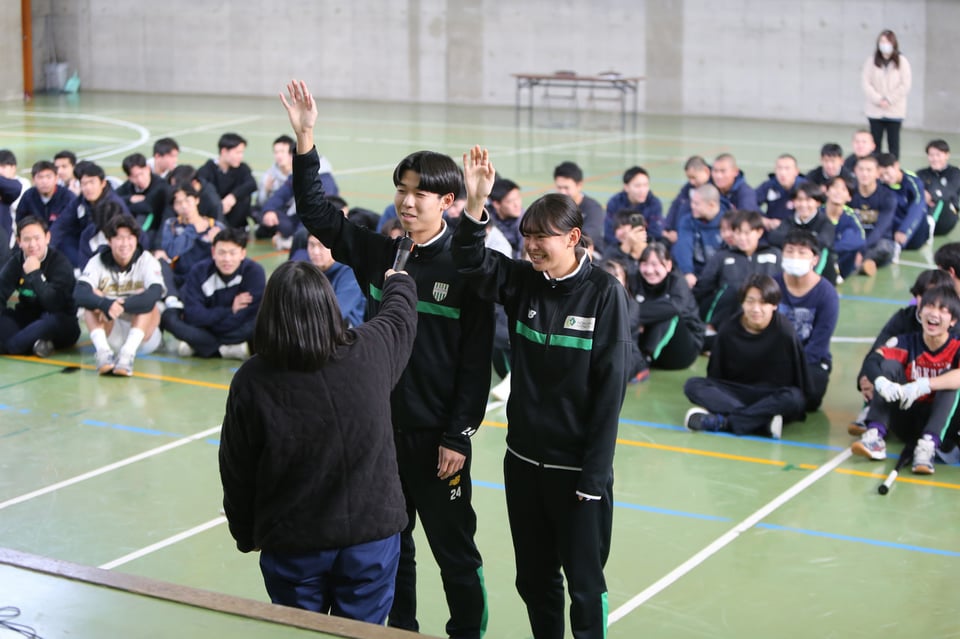 冬の体育祭が12月18日、突然指名の選手宣誓と3年生のダンスパフォーマンスで開幕しました。初日はバレーボール、バドミントン、卓球、PK対決、大縄跳びの5種目。バレーボールでは、ダンス部の山田玖旺(くお、2年)を中心とした普通コース(来春からユニバーサルコース)1、2年生合同チームのメンバーが大奮闘。全道大会優勝の野球部員、同ベスト8の男子サッカー部員らがそろうスポーツコースのクラスをおしのけて優勝しました。続くエキシビションマッチは接戦の末に教員チームに敗れましたが、見事な結果に会場は拍手に包まれました。