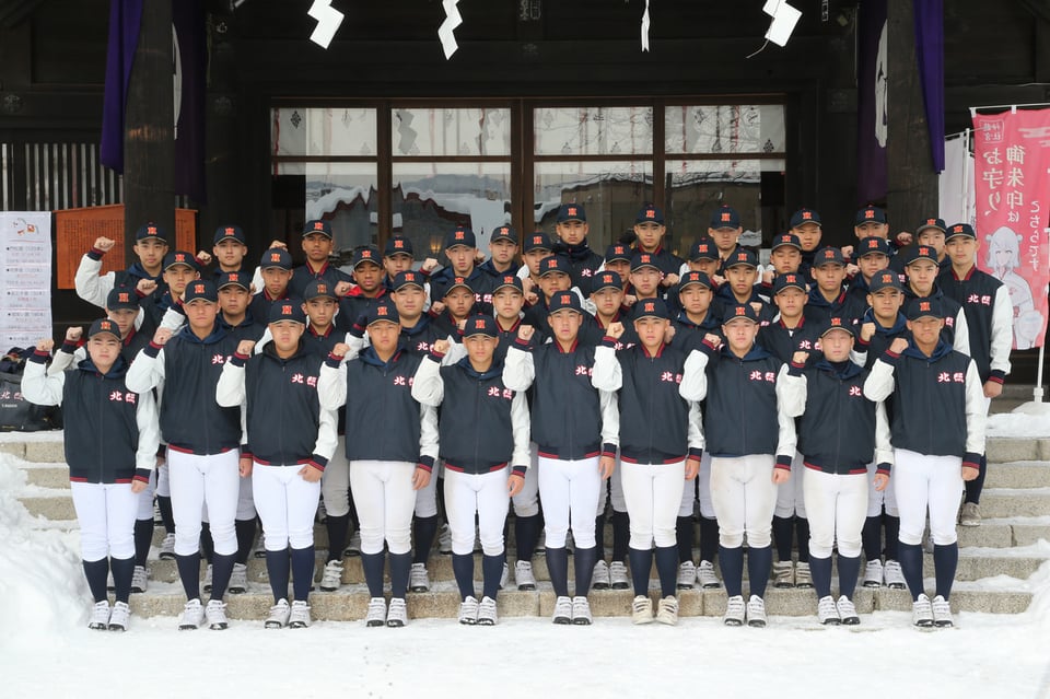 1、2年生の野球部員が1月10日午前、霊験あらたかな龍宮神社(小樽)で必勝祈願を行いました。同神社は、1876年(明治9年)に創建され、今年で150周年。2008年(平成20年)には、正式参拝した政治家が、その1ヶ月後に総理大臣になるなど開運・出世のご利益があるといわれ、全国大会で頂点を目指す北照ナインにピッタリです。この日は、夏の選手権、春の選抜の両大会の必勝を祈願する祝詞(のりと)を神職があげたあと、上林弘樹監督、手代森煌斗(きらと)主将(2年)らが玉串を捧げました。昨年の秋季北海道大会で打率6割を記録するなど、驚異的な打撃力で優勝の立役者となった畠山柊太外野手(2年)は「センバツ出場が決まったら、チームのために打撃で貢献したい。監督のおっしゃる通り、センバツ大会を通過点にして、夏の甲子園にも出場できるように頑張ります」と力強く話しました。