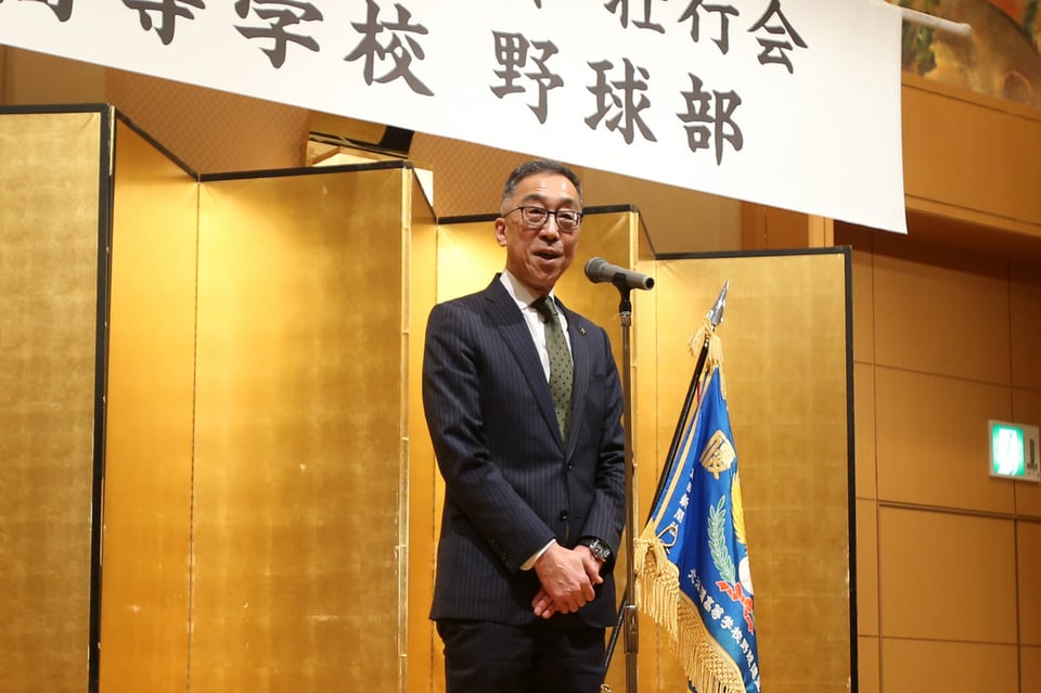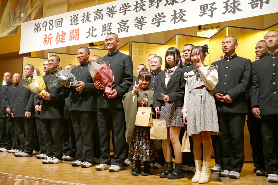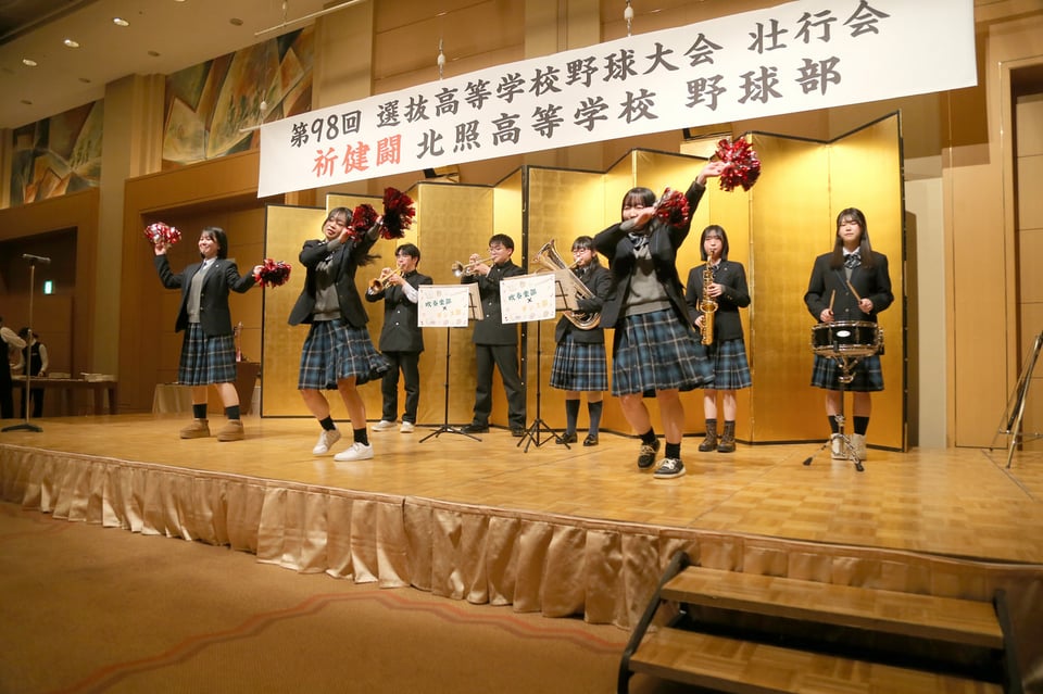 2月22日には、野球部父母会主催による壮行会が開かれました。選抜大会出場後援会長の迫俊哉小樽市長が「選手の皆さんの甲子園での健闘を心からお祈りしております」と挨拶。吹奏楽部とダンス部も、応援パフォーマンスで野球部メンバーの背中を押しました。手代森主将は「小樽代表としての責任を胸に、最後の一球まであきらめず戦い抜き、ベスト4の目標を達成します」と力強く宣言。上林弘樹監督も「北照旋風を巻き起こしたい」と、力強く話しました。