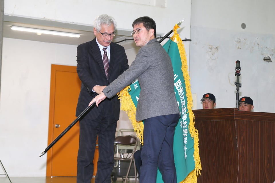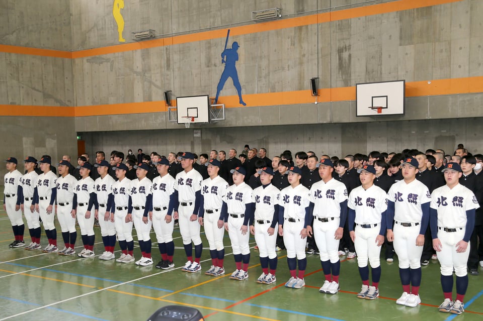 第98回選抜高校野球大会(3月19日開幕、阪神甲子園)に北海道代表で出場する野球部が3月2日、選抜旗授与式に臨みました。大会を主催する毎日新聞社の草野和彦支社長から小路校長に手渡された選抜旗を、手代森煌斗(きらと)主将(2年)が、両手でガッチリとつかみました。手代森主将は、「いろんな方々の思いが詰まった重さを感じます」と、旗を受け取った感想を口にし、13年ぶりのセンバツ甲子園に向けて、気持ちを新たにしていました。エース右腕の島田爽介投手(2年)は「完封勝利で必ずチームをベスト4以上に導きたい」と、引き締まった表情で話しました。選抜旗は、19日の開会式で手代森主将が持って入場する予定です。