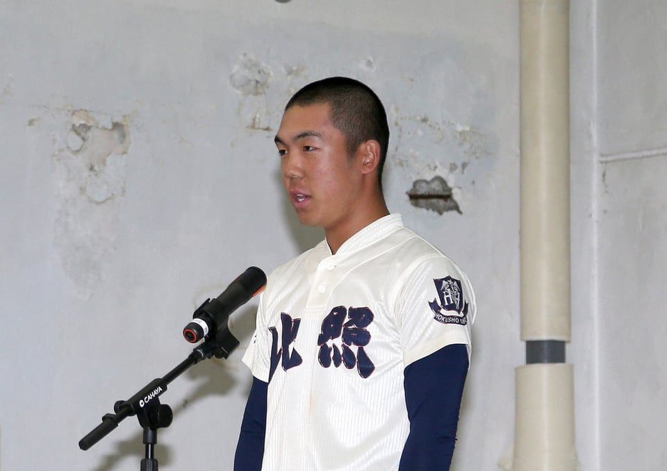 第98回選抜高等学校野球大会(3月19日開幕、阪神甲子園)の組み合わせ抽選会が3月6日午前9時から大阪・毎日新聞大阪本社オーバルホールで行われました。13年ぶり6度目出場の本校野球部は、大会3日目(3月21日予定)の第3試合で、昨秋の関東大会4強の専大松戸(千葉)と、1回戦突破をかけて対戦することが決まりました。そして出場校でただ一人の選手宣誓のくじを、手代森煌斗(きらと)主将(新3年)が引き当てました。前日のキャプテンミーティングでも32チーム中、唯一「自分がやりたい」と話していたという頼れるキャプテンは「(選手宣誓は)狙っていたのでうれしい。一生に一度の経験なので、やりたいと思っていました。『たくさんの方々に支えてもらった』という言葉は入れたい。頭の良い人に相談します」と、満面の笑みで話してくれました。